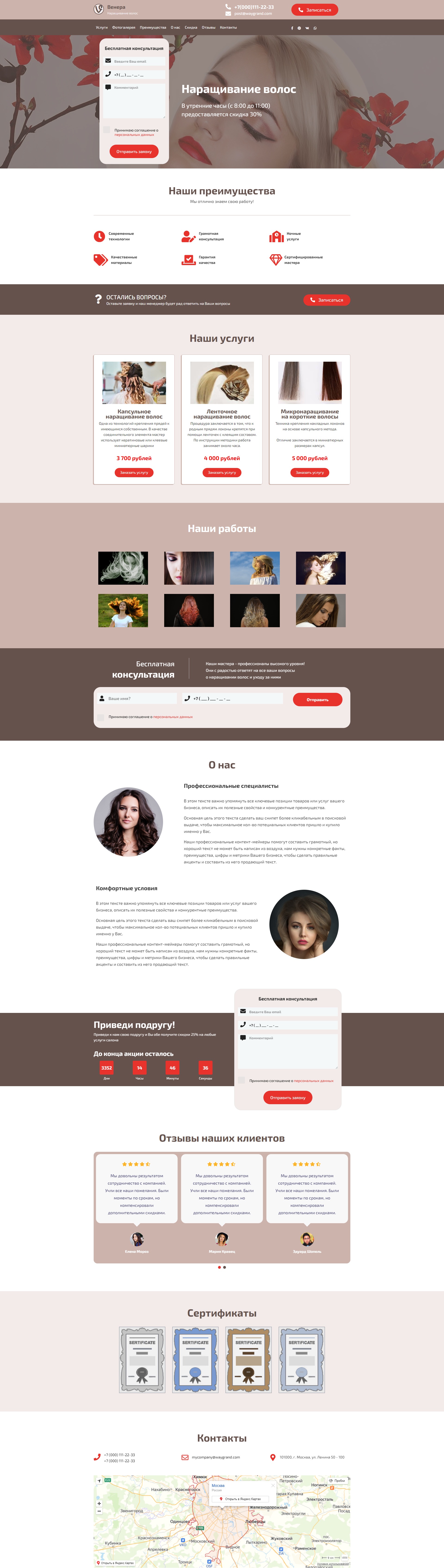 Закажите готовый продающий сайт лендинг #1108201 в Курске за 1-3 дня «под ключ»: свёрстан, отрисован и готов к рекламе. Тематика шаблона «Наращивание волос».