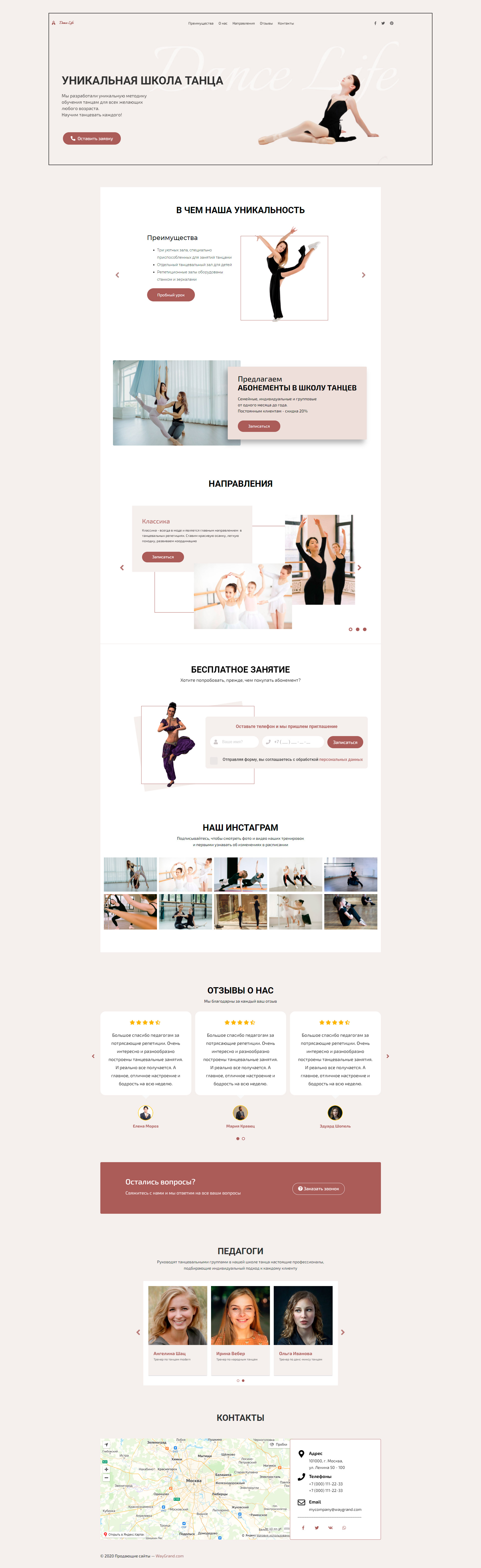 - Промоблок "Уникальная школа танца" с кнопкой призыва к действию "Оставить заявку"